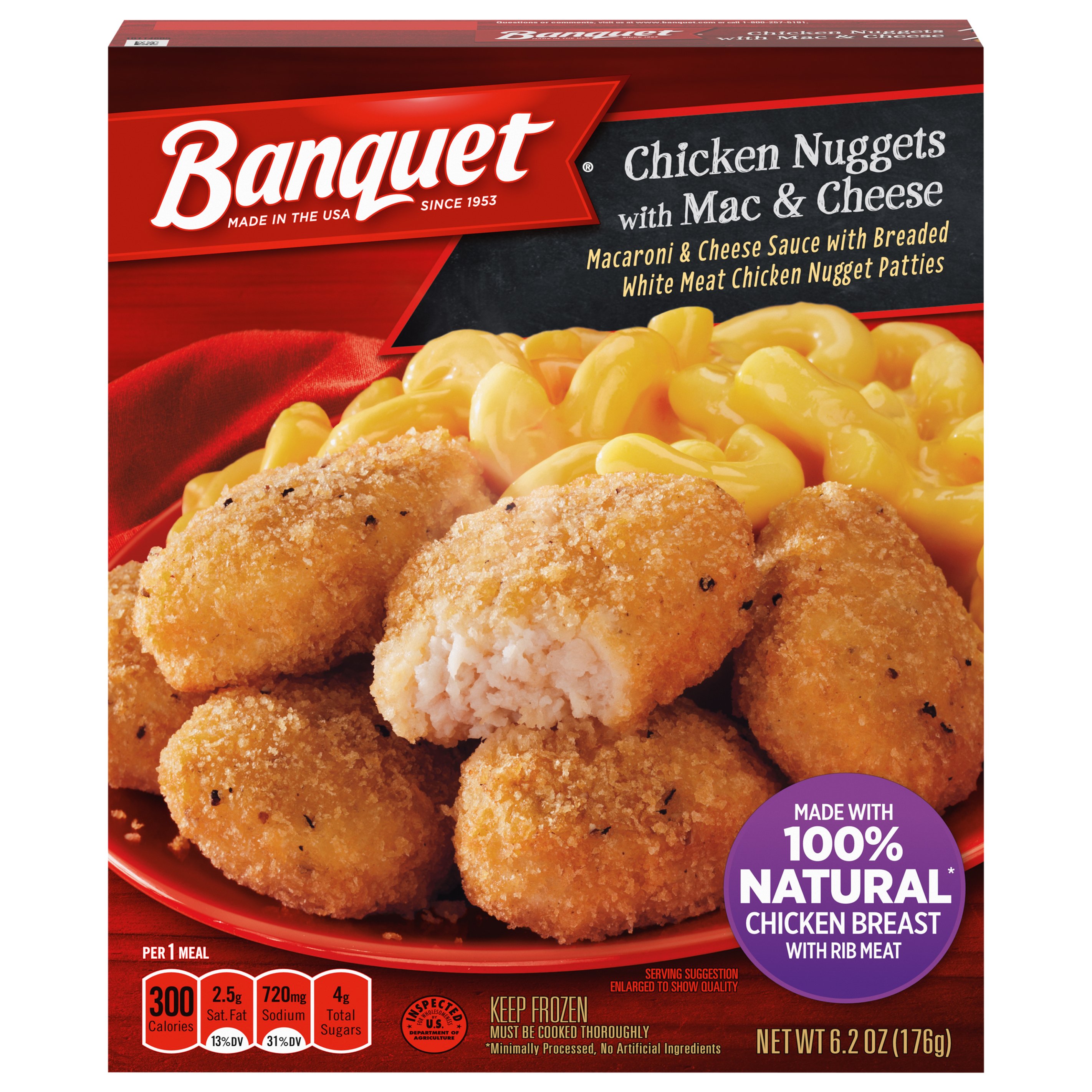 All banquet chicken products and meals are made with 100% natural chicken breast! I believe i got my dollar's worth out of it for quality. With quality, mouthwatering ingredients, a great meal is minutes away with banquet basic chicken fingers. There are 480 calories in 1 meal (201 g) of banquet chicken fingers meal. Banquet chicken fingers meal, 7.1 ounces breaded chicken patties, macaroni & cheese sauce and a fudge brownie 480 calories per meal